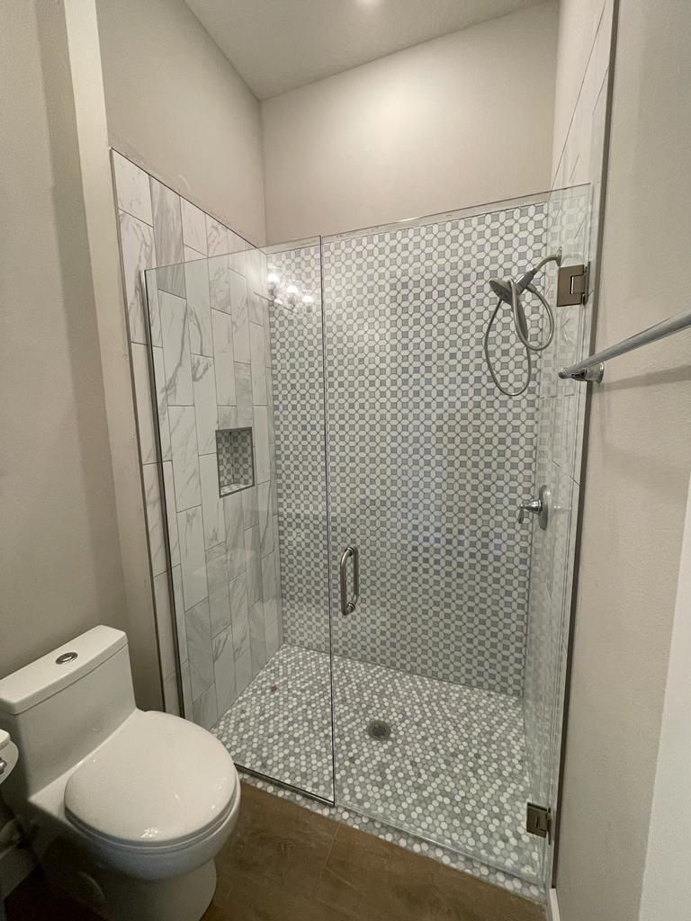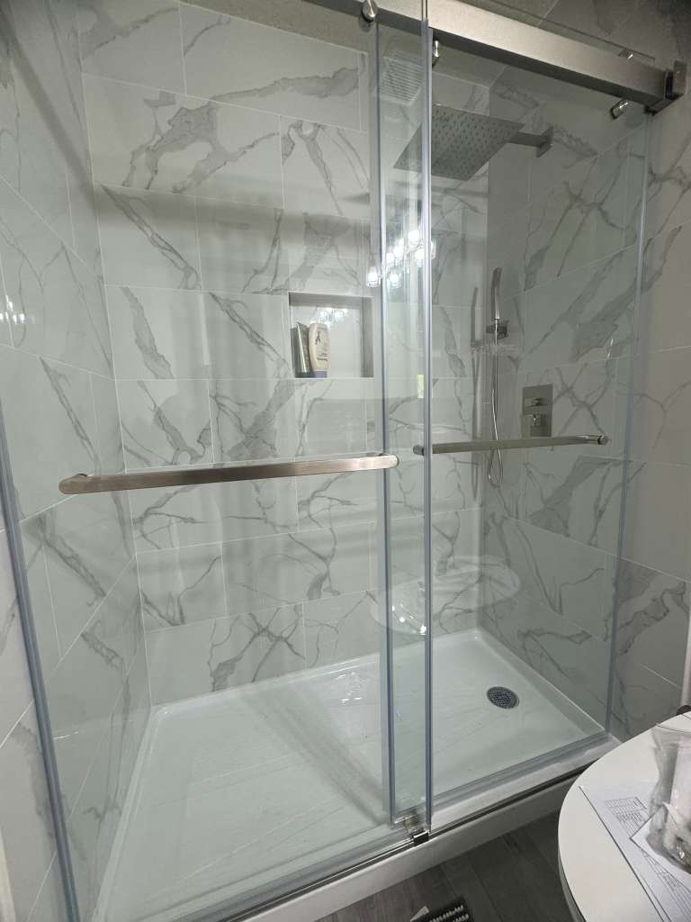 Modern shower remodel with textured tile walls, niche detail, and frameless glass door, clean, elegant, and elevated.